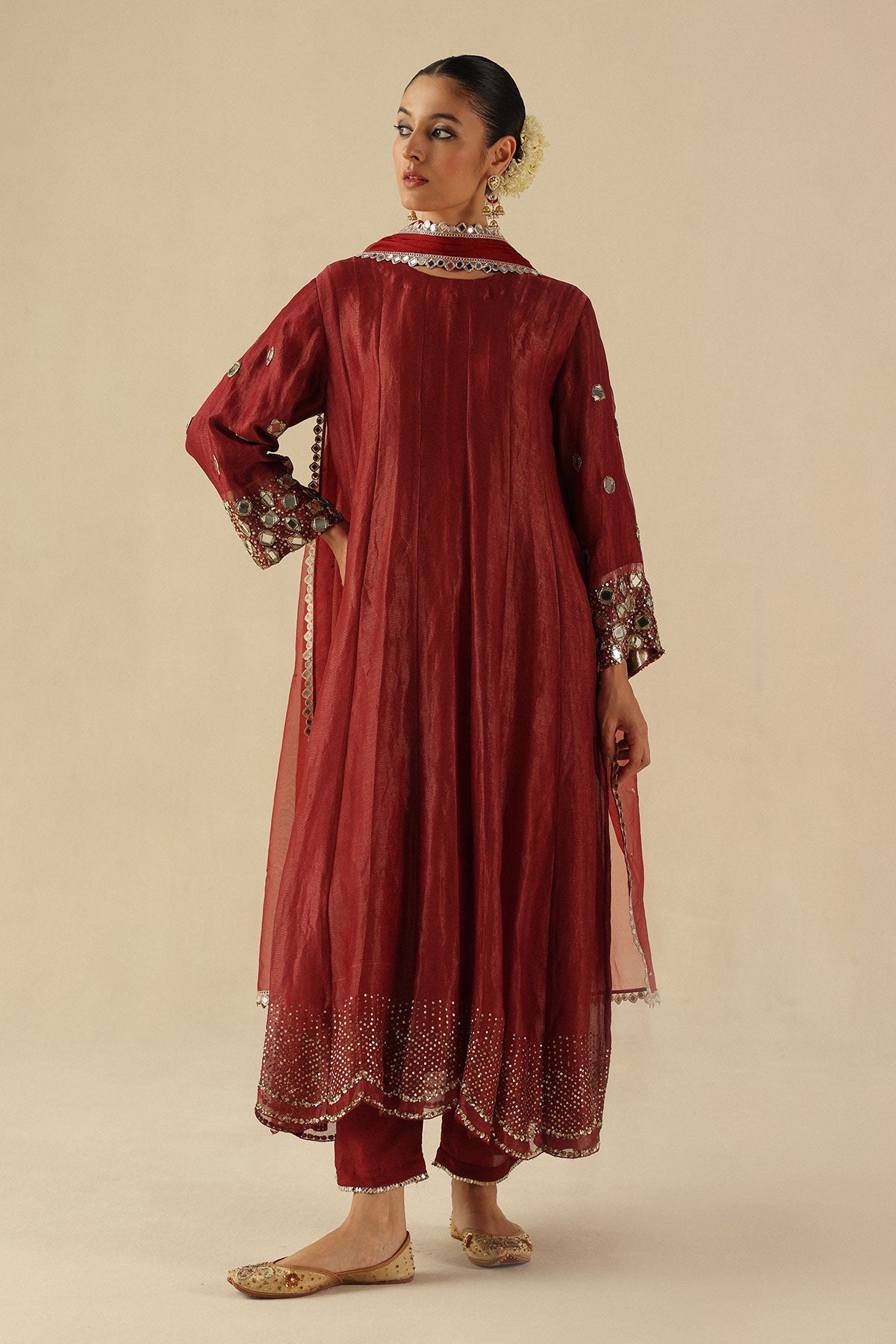 The Afsana Kalidar Is A Graceful Ode To Traditional Craft, Tailored In Opulent Zari Silk And Brought To Life With Meticulous Hand-Embroidered Mirror Work Across The Sleeves. The Flowing Kalidar Sweep Is Adorned With Delicate Hand-Sequined Scallop Embroidery, Adding Movement And Sparkle To Every Step. Paired With Habutai Silk Pants And A Sheer Organza Dupatta, Both Accented With Shimmering Mirror Work, This Ensemble Is Designed For Effortless Elegance At Festive Gatherings.