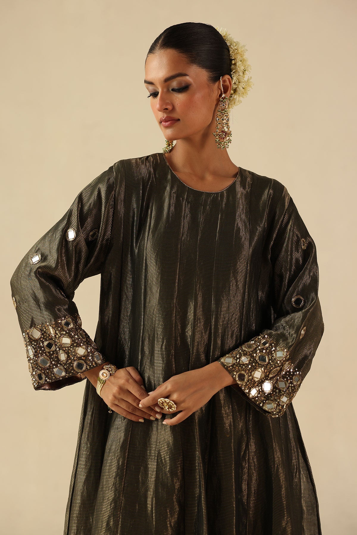 The Afsana Kalidar Is A Graceful Ode To Traditional Craft, Tailored In Opulent Zari Silk And Brought To Life With Meticulous Hand-Embroidered Mirror Work Across The Sleeves. The Flowing Kalidar Sweep Is Adorned With Delicate Hand-Sequined Scallop Embroidery, Adding Movement And Sparkle To Every Step. Paired With Habutai Silk Pants And A Sheer Organza Dupatta, Both Accented With Shimmering Mirror Work, This Ensemble Is Designed For Effortless Elegance At Festive Gatherings.