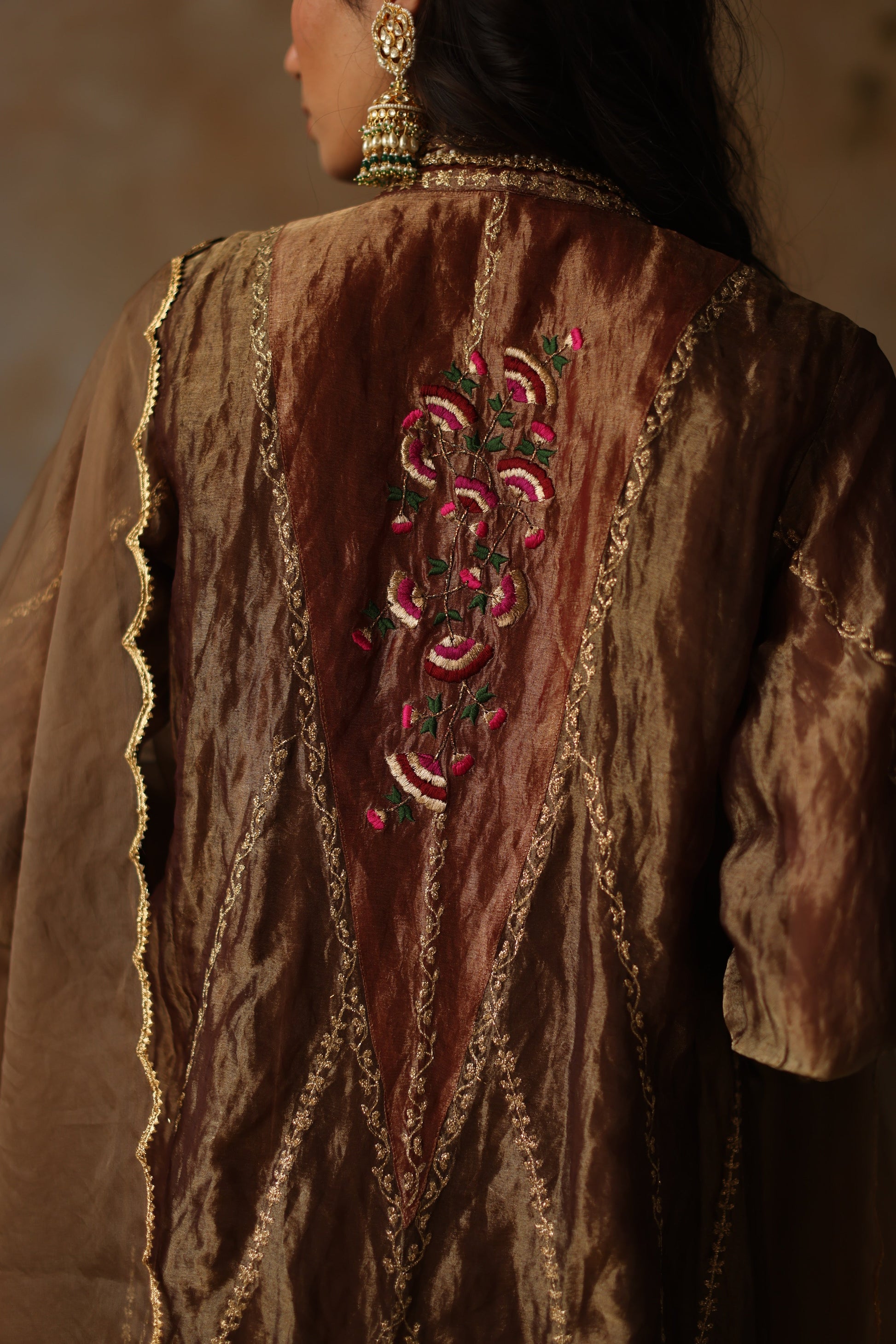 Silk tissue kurta adorned with resham, zari, and nakshi detailing in an asymmetrical design, complemented by resham, zari and tilla florals bootis on sleeves and back.Paired with Zari weave pants, finished with gota work. The ensemble is elevated by a gold scallop organza Dupatta.