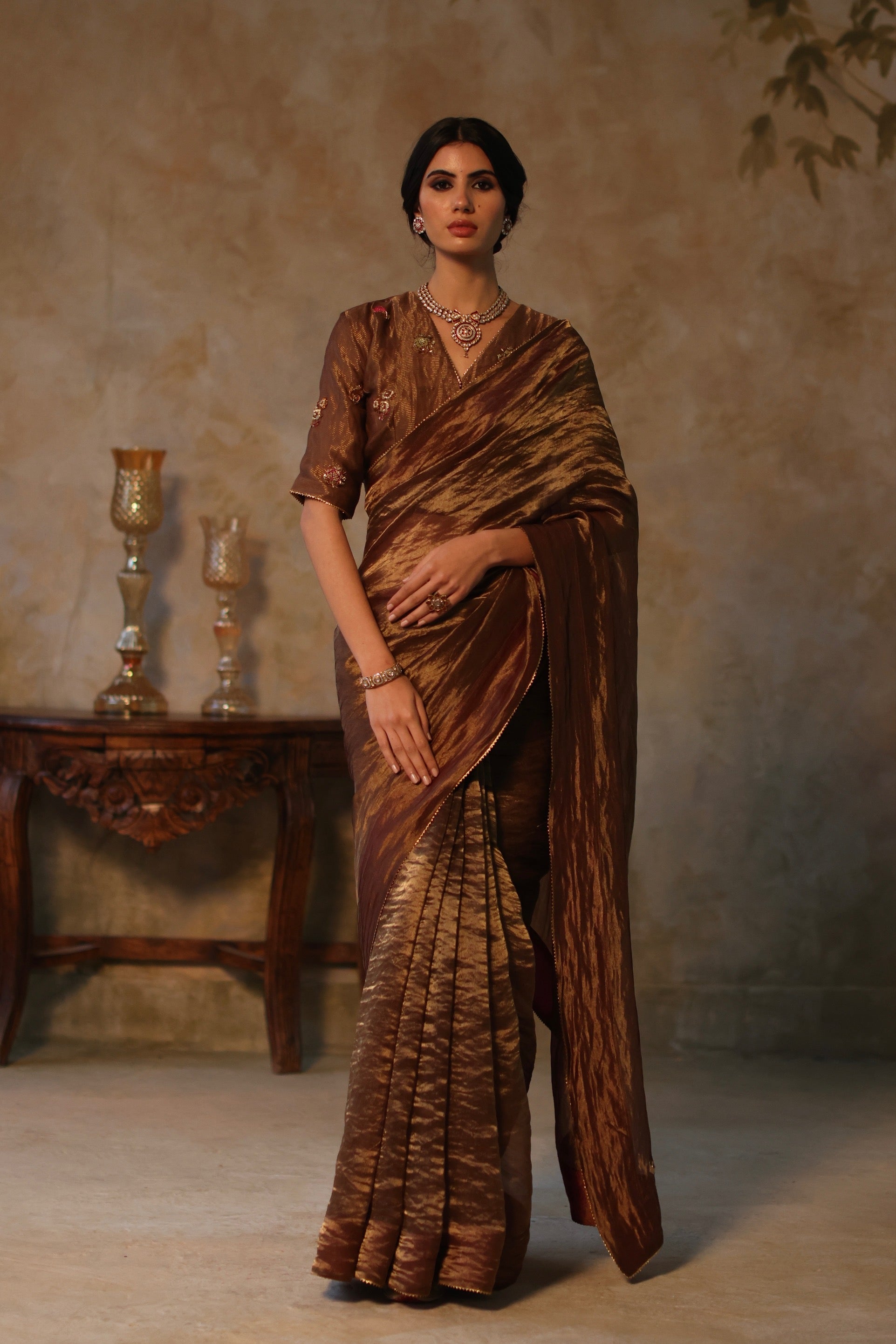The zari silk blouse exudes opulence and elegance and is adorned with intricate dabka, zardozi, nakshi, and dori floral work. Paired with a statement silk tissue saree, it is perfect for any special occasion.