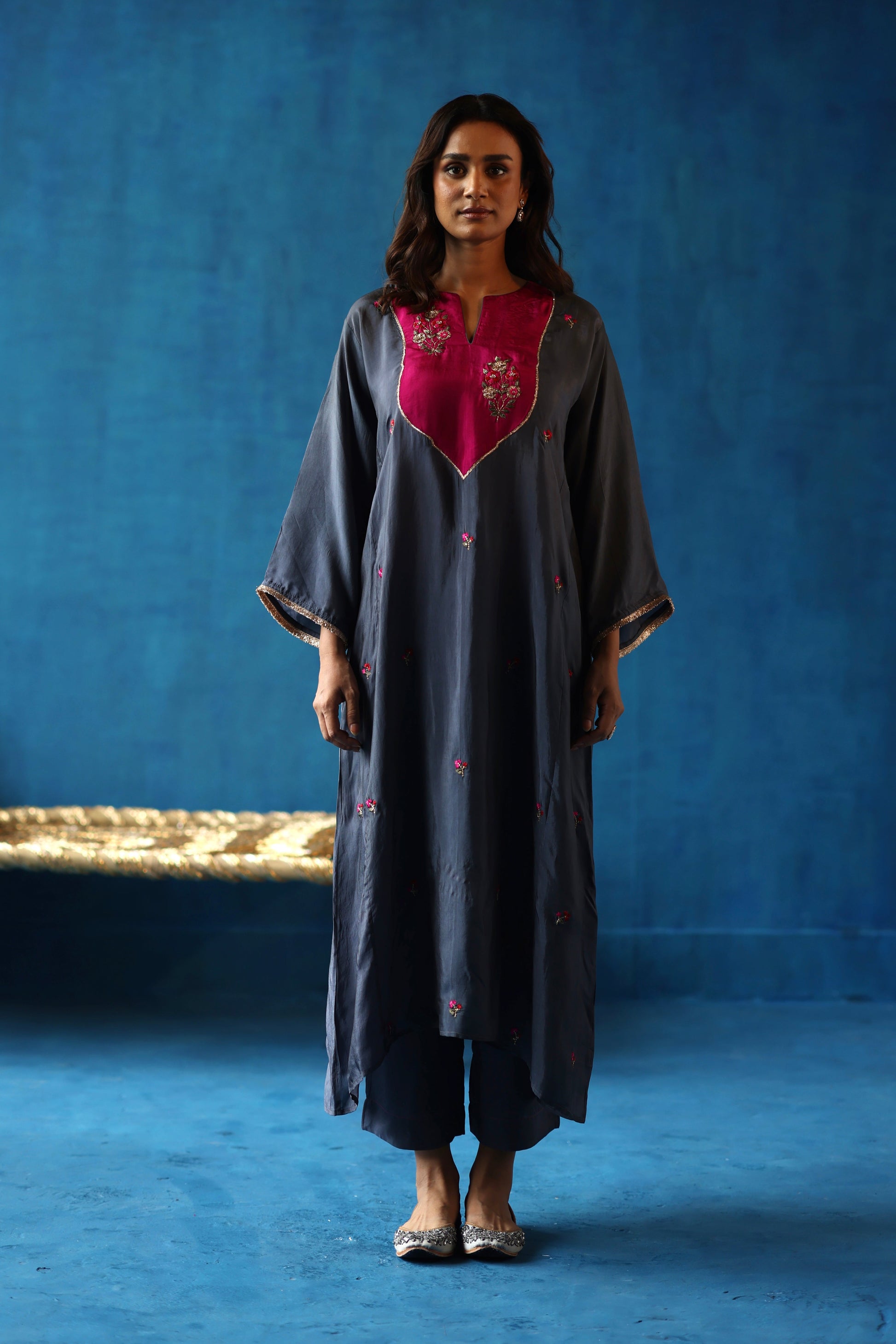 Habutai silk phiran, adorned with intricate hand-embroidered tilla, gota, resham, and zari work detailing on the yoke with contrasting colours along with gold fringes on the sleeves. Paired with Habutai pants.