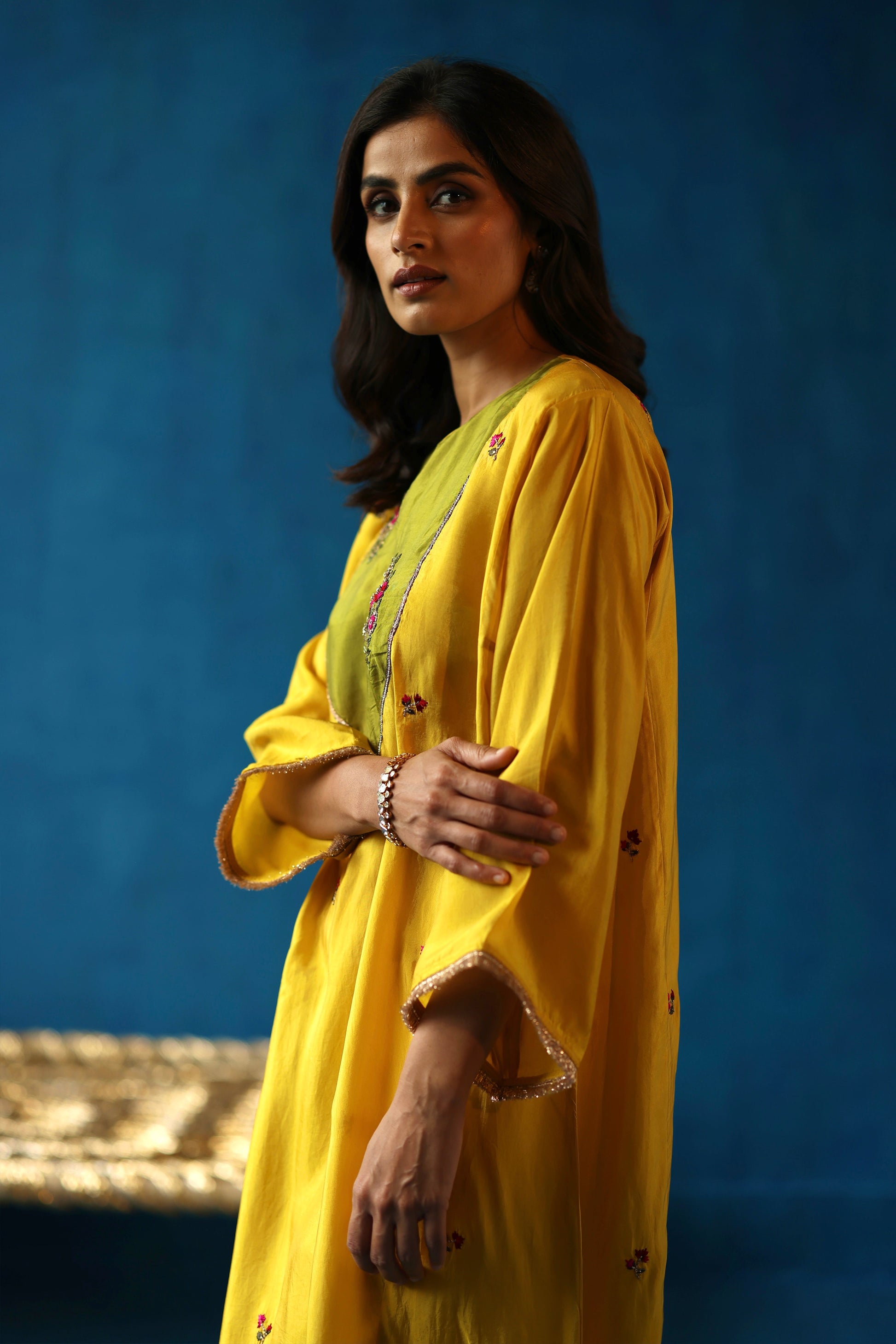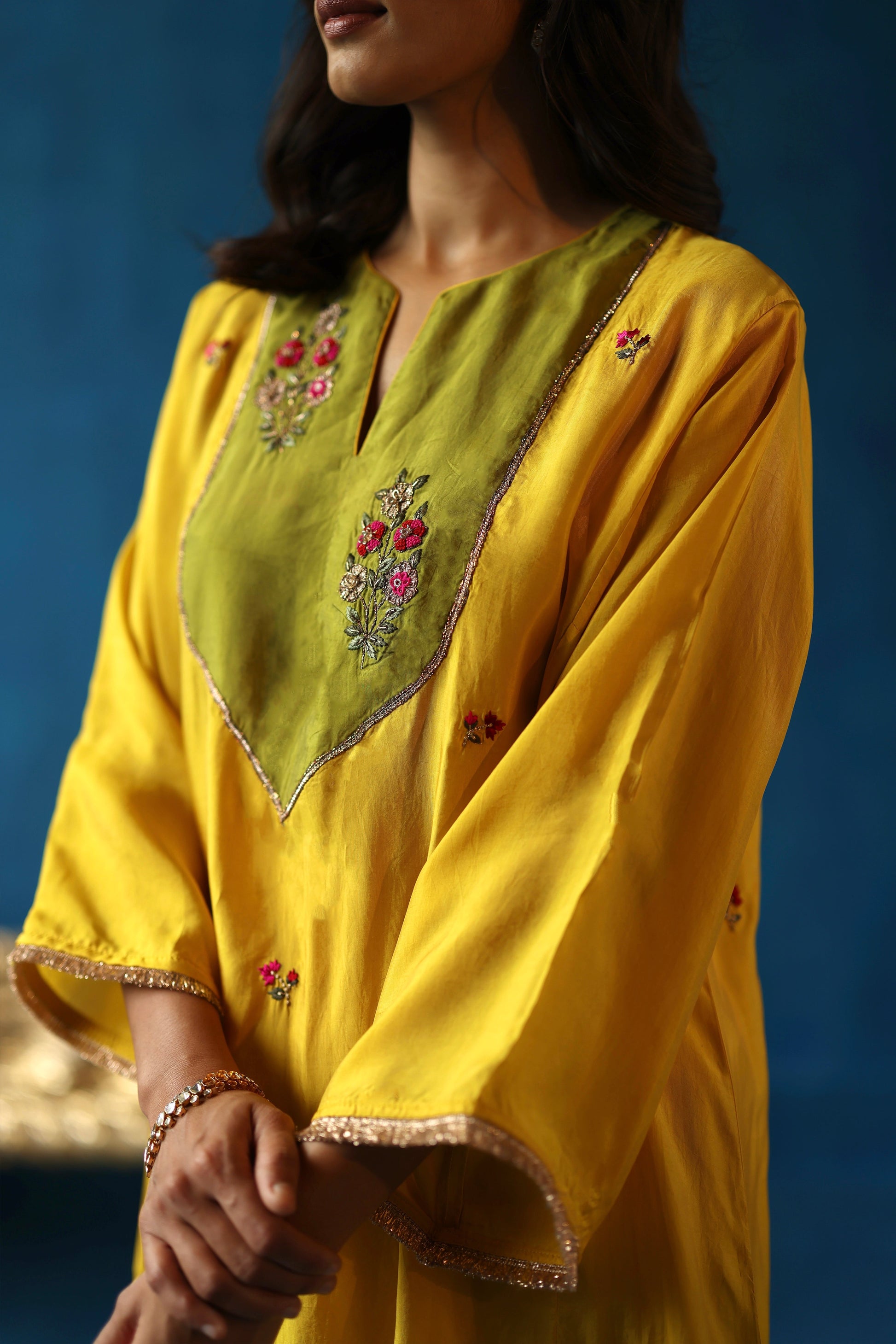 Habutai silk phiran, adorned with intricate hand-embroidered tilla, gota, resham, and zari work detailing on the yoke with contrasting colours along with gold fringes on the sleeves. Paired with Habutai pants.