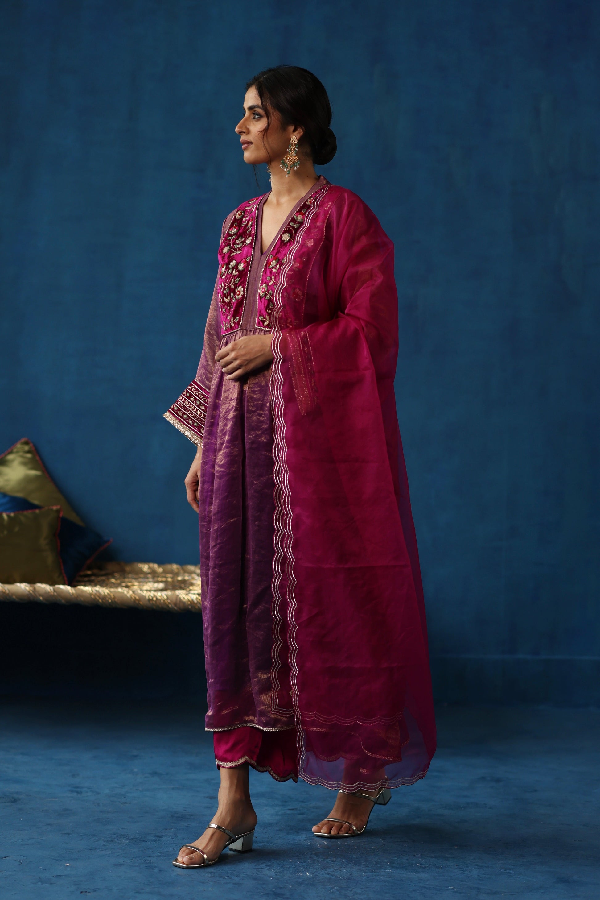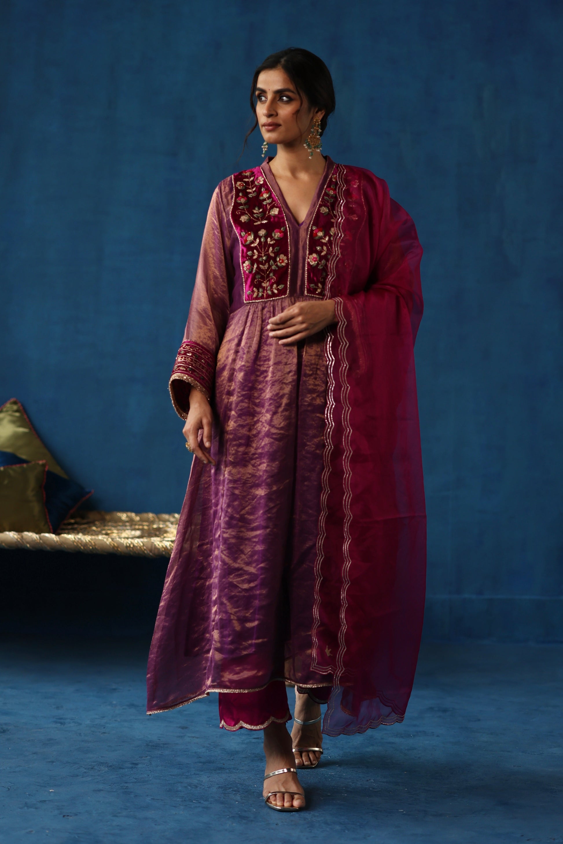 Zari silk kurta set adorned with velvet and embellished with hand-embroidered tilla, zari, resham, danka, and gota work in the yoke and sleeves. Paired with satin pants and an organza dupatta with taar work in scalloped edges.