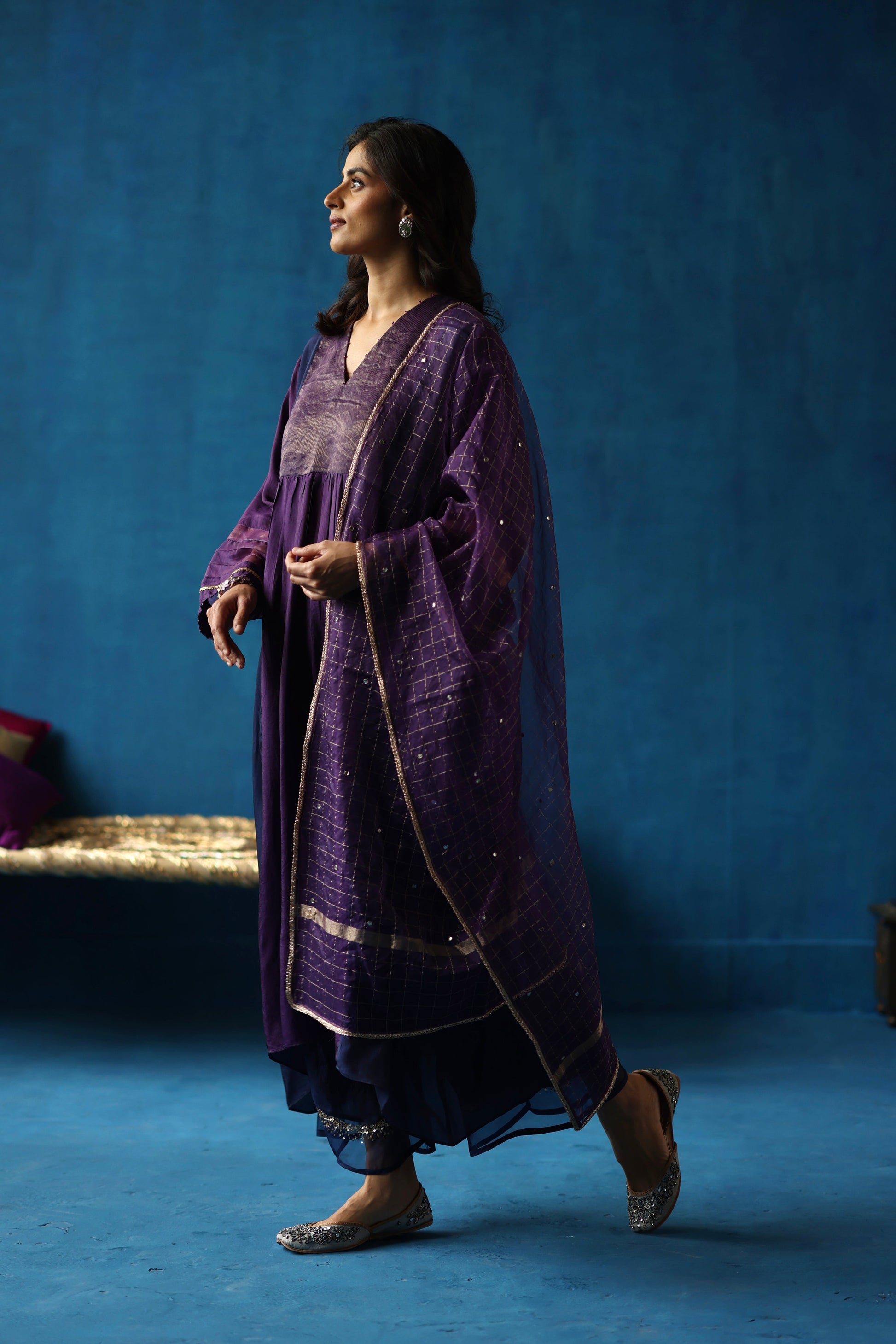 Jamun Kurta Set features contrasting color panels, zari silk yoke, delicate gatherings on the front, and dainty accents on the neck and sleeves. Habutai silk pants complement the Habutai kurta and a checkered organza stole.