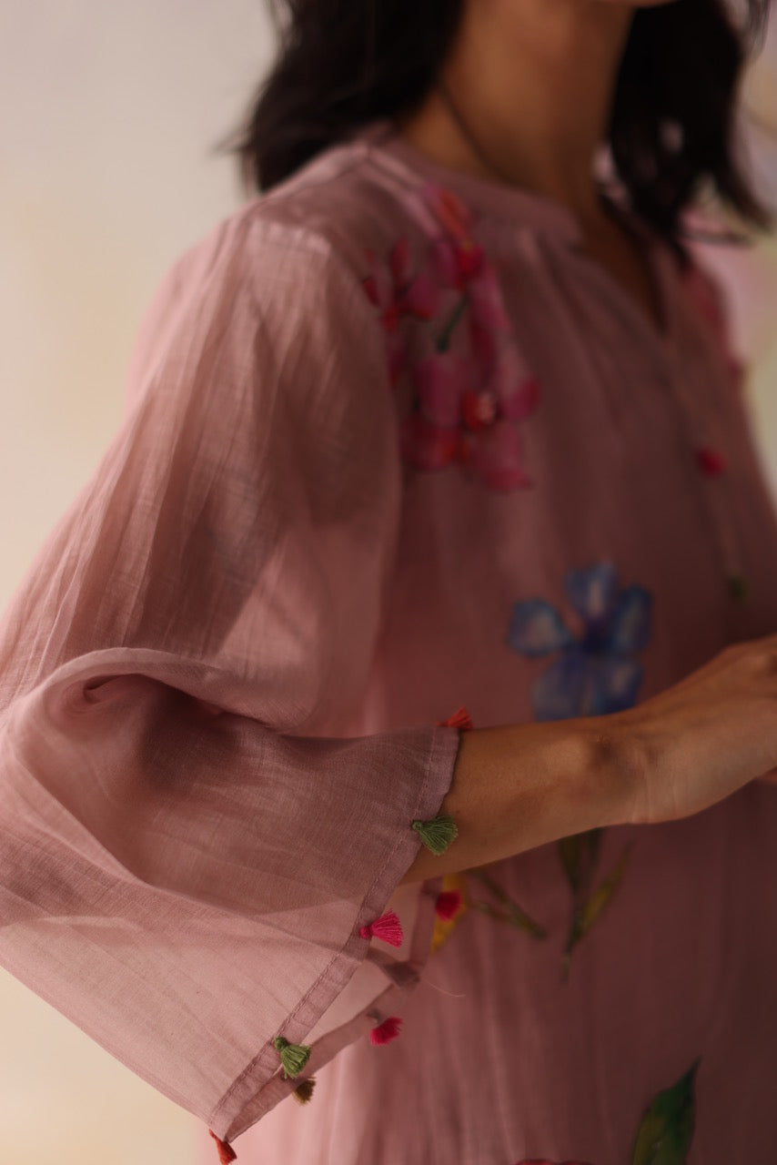 Chanderi kurta set, featuring intricate Cut Dana and bead work delicately placed on watercolour floral appliqués. The front open design is adorned with hand-embroidered buttons along the cuffs. The sleeves are embellished with tassels and the kurta comes with pockets for maximum function.
