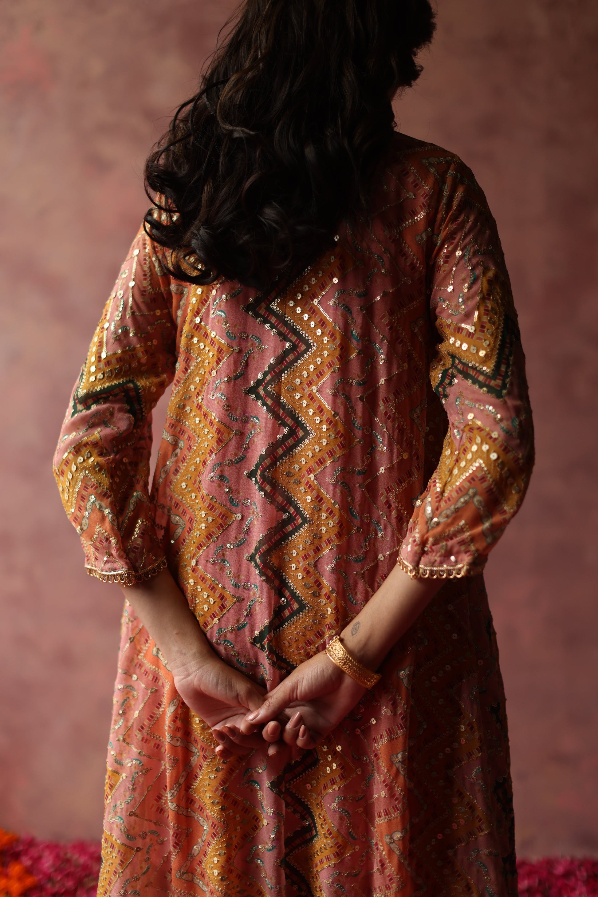 The kurta set is crafted in georgette fabric embellished with sequins and showcases a chevron pattern in contrasting colors. The plank-cut collar of the kurta with buttons adds a subtle yet stated look, with sleeves trimmed with gota. Paired with the kurta is a pair of palazzo pants.