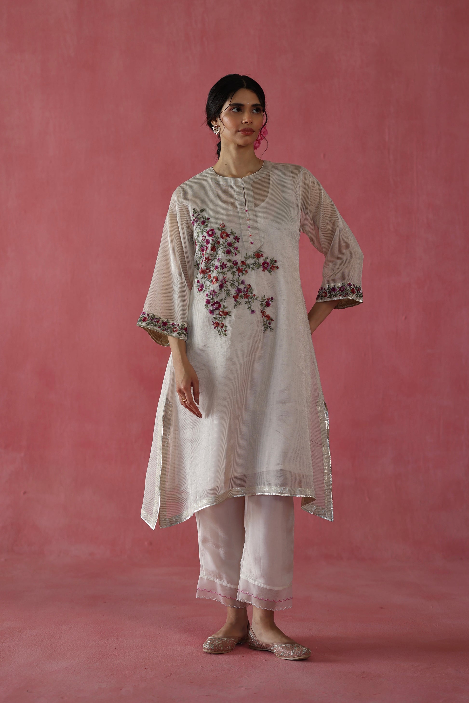 Kurta in Banarasi Zari silk, adorned with intricate Zari, Resham, Sequin, and Gota work, all over the kurta and the sleeves. The kurta is paired with Habutai silk pants with scalloped contrast organza, along with an organza dupatta with dainty hand embroidered bootis.