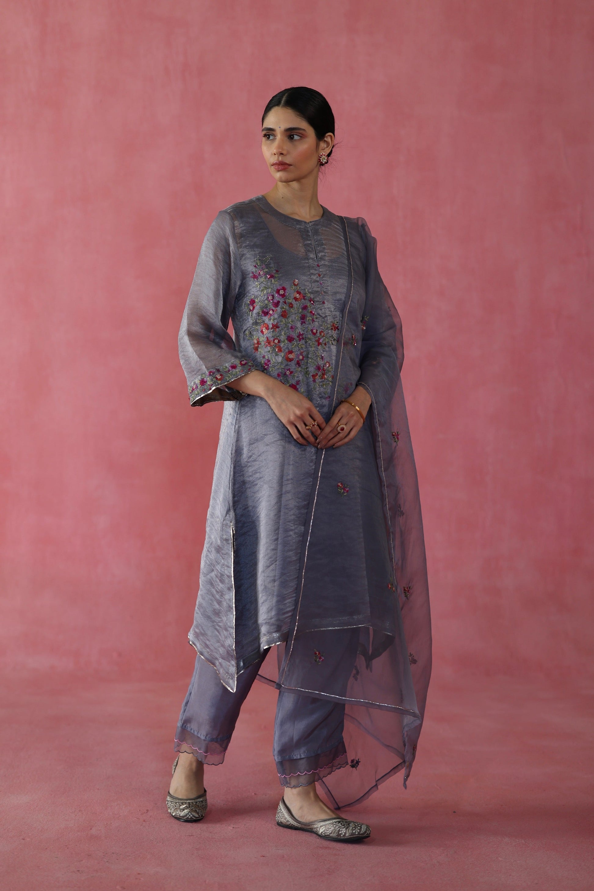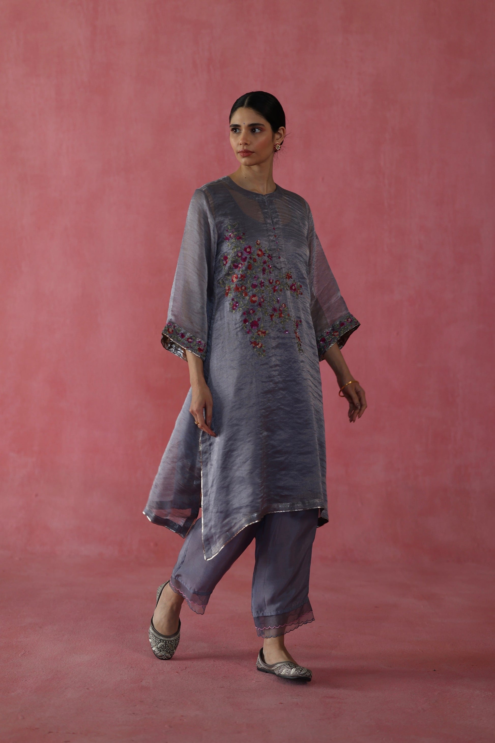 Kurta in Banarasi Zari silk, adorned with intricate Zari, Resham, Sequin, and Gota work, all over the kurta and the sleeves. The kurta is paired with Habutai silk pants with scalloped contrast organza, along with an organza dupatta with dainty hand embroidered bootis.