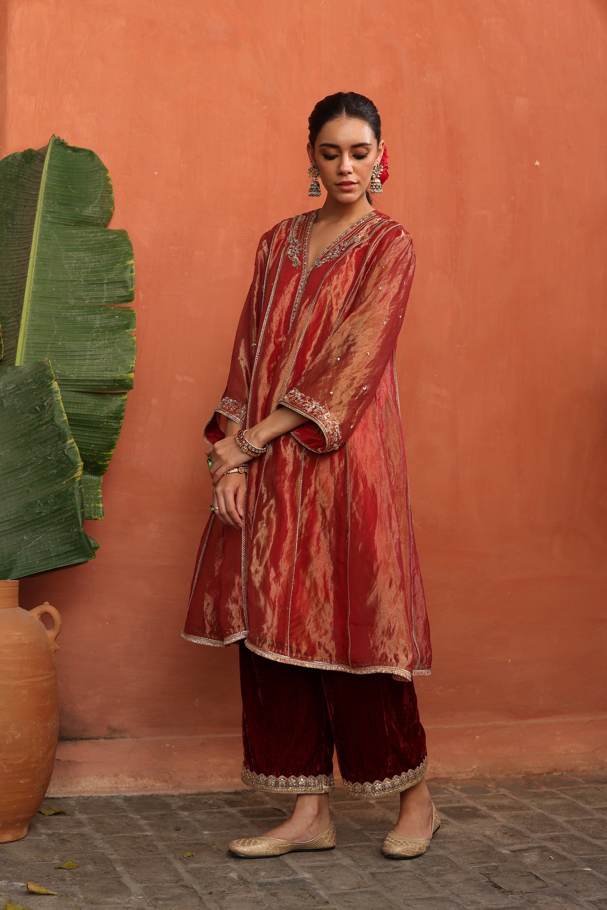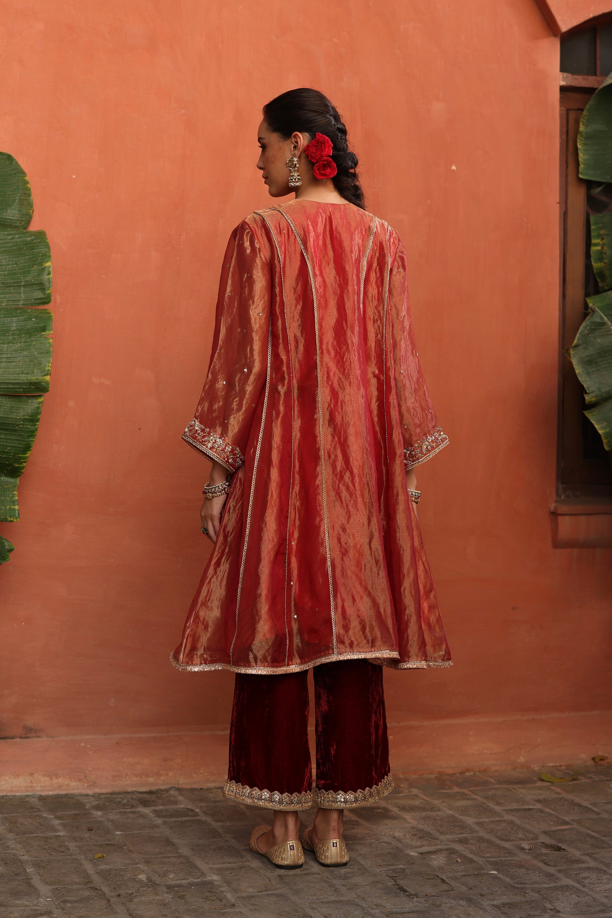 A pure tissue silk kurta with gold-lined kalis adorned with dabka, nakshi and zardozi handwork, with sequin details. Paired with velvet pants featuring Gota patti work and a stole accented with tassels, perfect for this festive and wedding season.