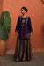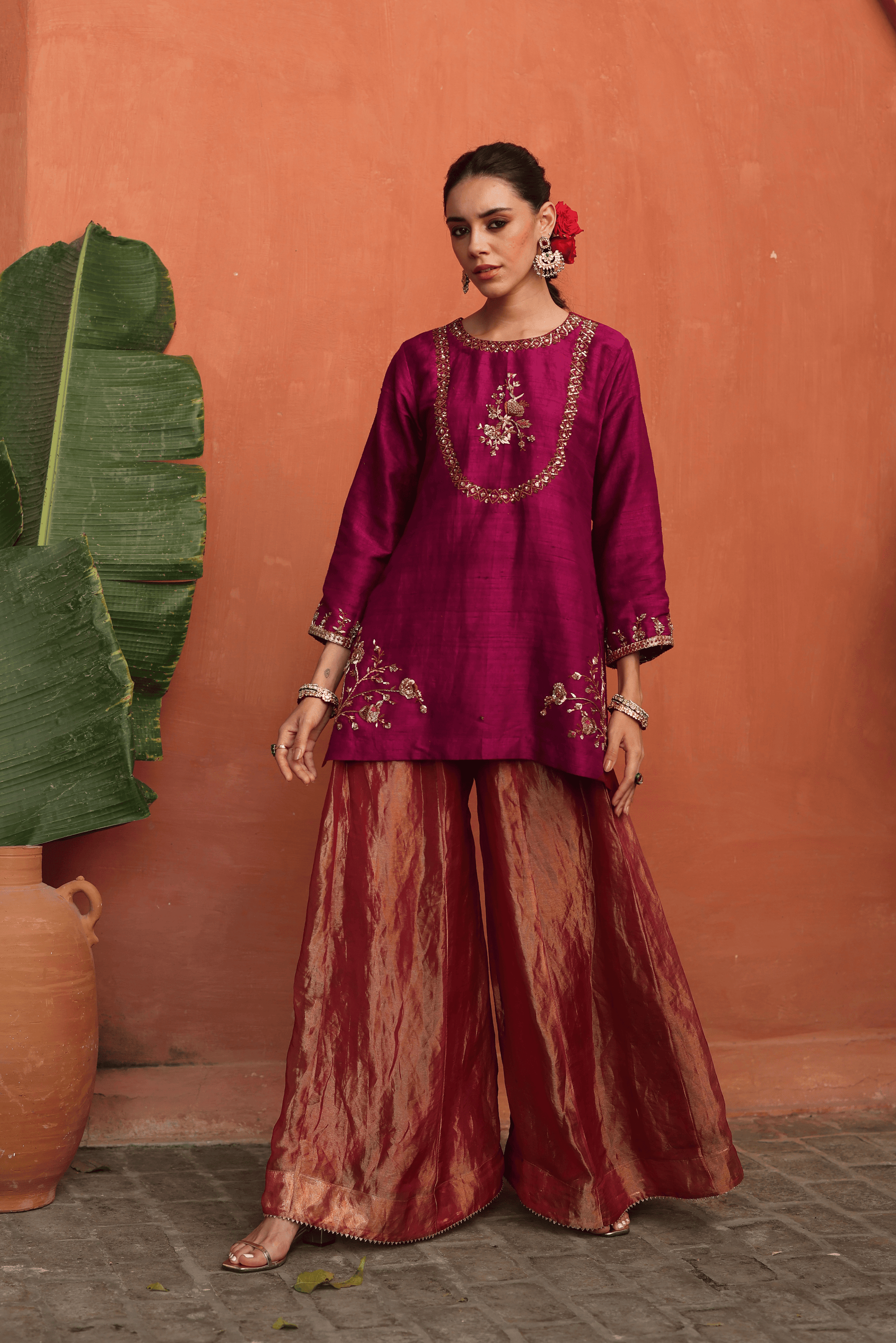 A raw silk short kurta featuring intricate dabka, moti, nakshi, and zardozi detailing. Paired with a silk tissue sharara and a stole adorned with gota and dainty bootie work.