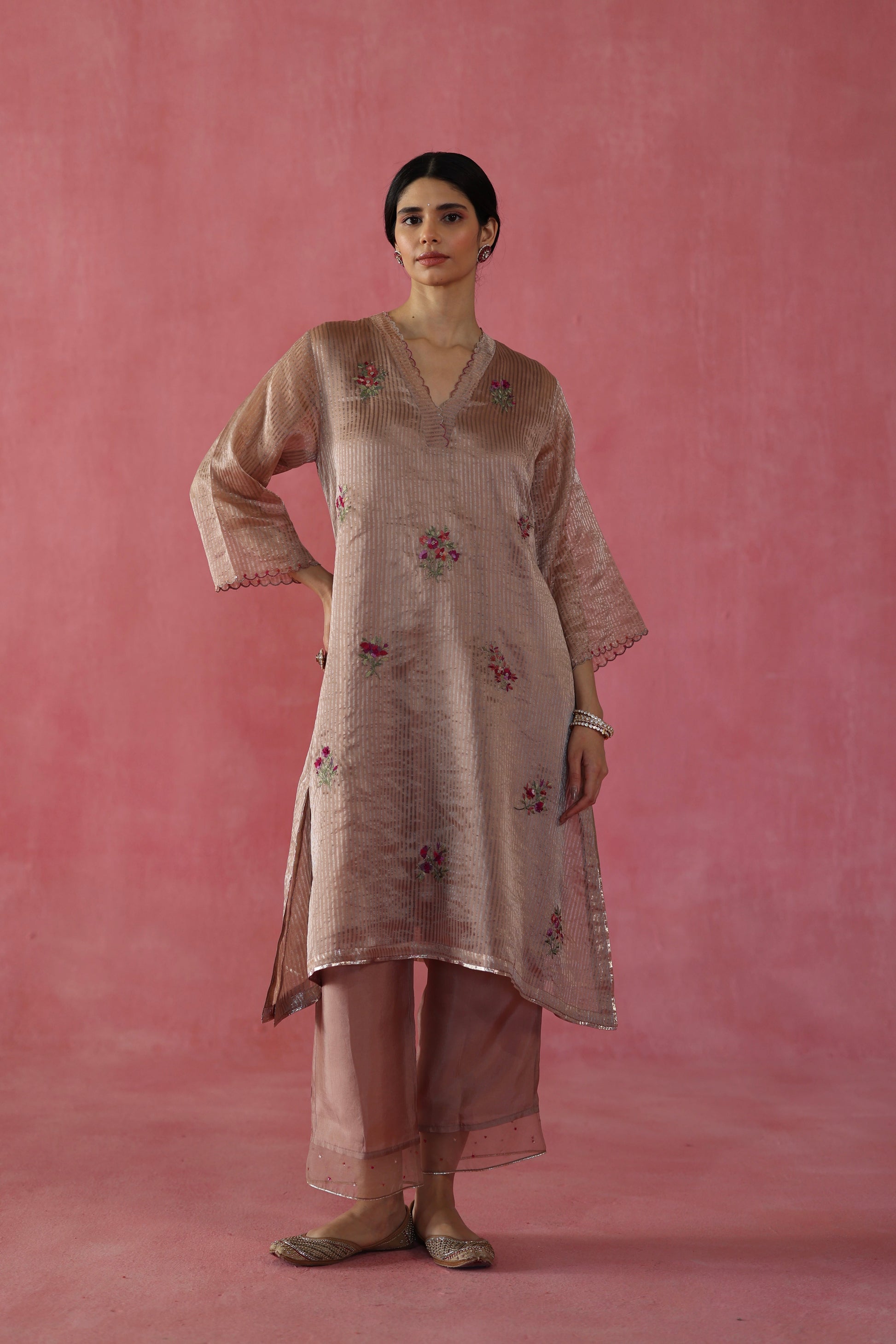 Kurta in Banarasi Zari silk, adorned with intricate Zari, Resham, Sequin, and Gota work, all over the kurta and the sleeves. The kurta is paired with Habutai silk pants with sequinned organza, along with an organza dupatta with dainty hand embroidered bootis.